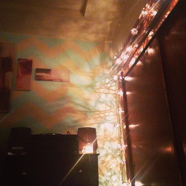 Wicker lights spraying geometric shadows onto chevron stenciled wall.